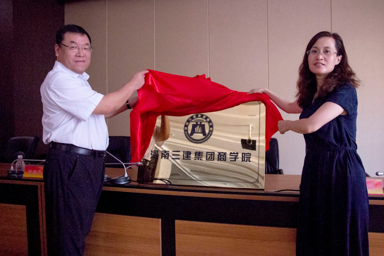 集團(tuán)公司董事長、河南三建集團(tuán)商學(xué)院黨委書記張超鄭重宣布——河南三建集團(tuán)商學(xué)院成立,并與洛陽理工學(xué)院副校長丁梧秀教授共同為河南三建集團(tuán)商學(xué)院揭牌。